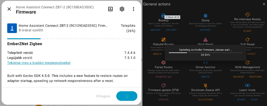 Ezek a bővítmények folyamatosan foglalják az antennát, így frissítés előtt először le kell állítani őket! Ezt a Home Assistant felületén a Beállítások → Bővítmények menüben teheted meg – keresd meg a Zigbee2MQTT vagy Z-Wave JS bővítményt, állítsd le, majd ezután indítsd el a firmware-frissítést! Ha kész, a bővítmény újraindítható, és minden megy tovább, mintha mi sem történt volna.