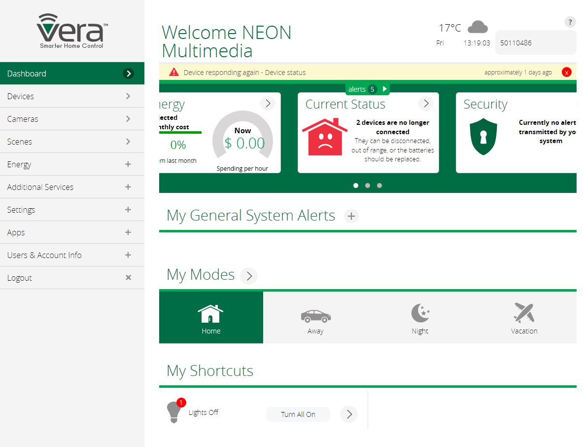 A kezelőfelület főképernyője. Itt találhatók a legfontosabb információk otthonunkról. A képernyő felső részében az eszközök állapotáról és riasztási eseményekről tájékozódhatunk. Alatta (My Modes) a rendszerünk üzemmódjai, előre meghatározott állapotai között válthatunk. Ez a legegyszerűbb módja annak, hogy okosotthonunk eszközei egy gombnyomással más-más állapotba kerüljenek. Beállíthatunk otthoni, éjszakai, távolléti és vakáció állapotokat, könnyedén definiálhatjuk, hogy melyik eszközünk milyen állapotot vegyen fel és hogyan működjön az adott módban. Pl. az éjszakai módnál beállíthatjuk, hogy az összes lámpa le legyen kapcsolva, a fűtés egy pár fokkal kisebbre legyen állítva, és a ház melyik része legyen figyelve a riasztáshoz használt szenzorokkal.