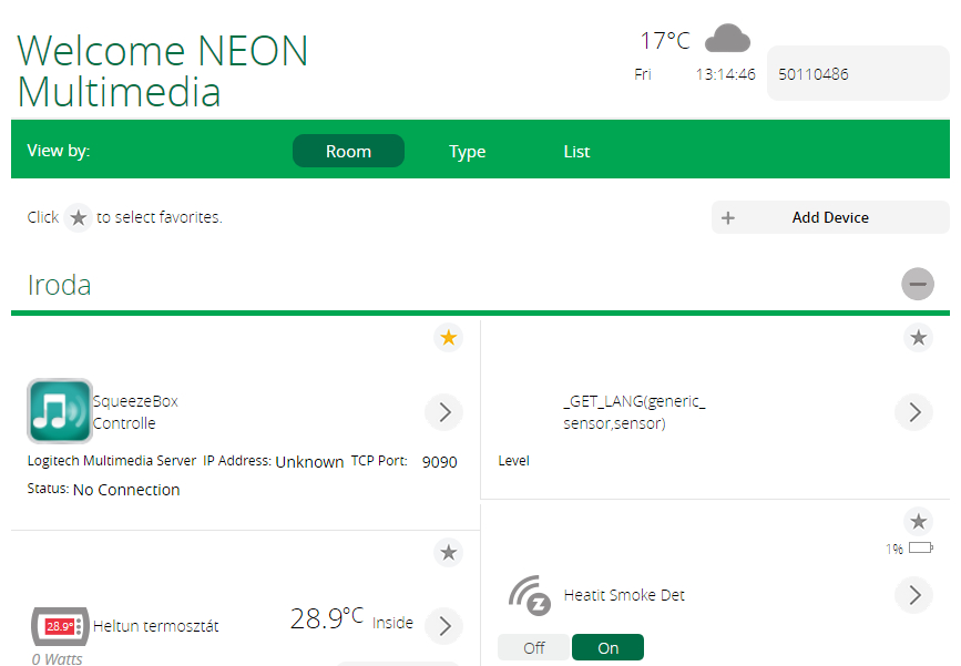 A My Favorites (kedvencek). Itt azon eszközeink lesznek, melyeket a csillag ikonnal kiválasztottunk. Azokat érdemes ide tenni, amelyeket gyakran használunk, így már a főképernyőn elérhetők lesznek. Megjeleníthetjük eszközeinket szoba, típus vagy lista formában rendezve.