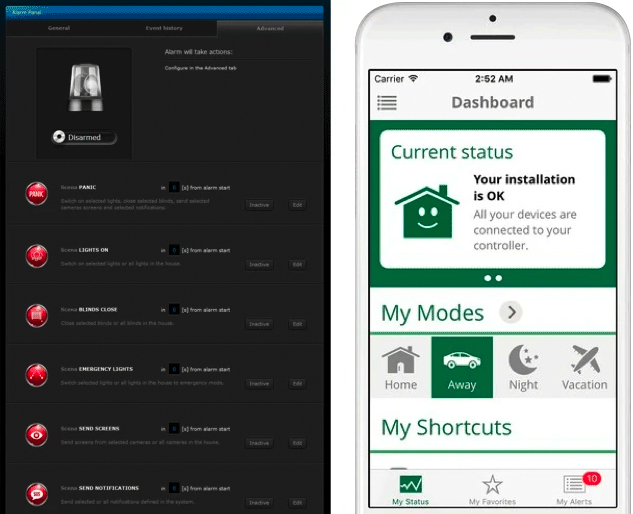 Beállítható az otthon/távol mód (azaz nincs élesítve a riasztó, illetve élesítve van), az éjszakai mód (amikor otthon vagyunk ugyan, bizonyos mozgásérzékelők pl. érzékelhetnek minket riasztás nélkül is, de pl. a bejárati ajtó nyitása már váltson ki riasztást, hiszen bizonyosan nem mi nyitjuk ki éjjel), vagy éppen a nyaralás mód (amikor hosszabb időre magára hagyjuk a lakást, de pl. szeretnénk, ha az okosotthon úgy kapcsolgatná a lámpákat – de akár a TV-t, rádiót is –, hogy külső szemlélőnek ne tűnjön elhagyatottnak, minden esetre másként működjön a rendszer, mint ha csak napközben vagyunk távol).
