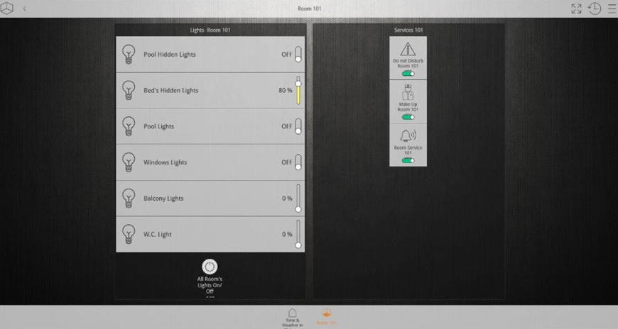 A vendégek a szoba falába épített ComfortClick Bobcat androidos kezelőfelületen (illetve akár saját okostelefonjukon is) az apartmanjukban található multimédiás készülékeket is vezérelhetik. Például az okostévét, zenét játszhatnak le egy előre megadott listából, vagy különböző streaming szolgáltatón (pl. Spotify) keresztül.