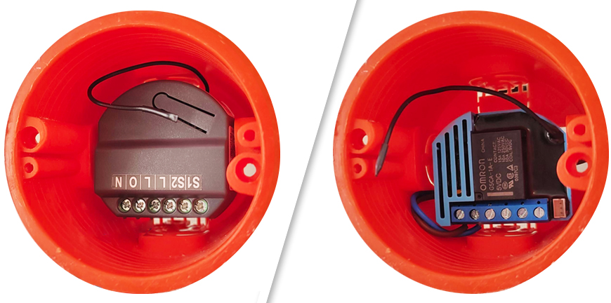 Bár a mérete nagyobb mint egy szokványos relémodul, egy mélyített szerelvénydobozba tökéletesen elhelyezhető. Ha pedig kötődobozba szeretnénk telepíteni, akkor mégkönnyebben és kényelmesebben csatlakoztatható az eszköz. De nézzük a gyakorlatban, a két modult beépítve egy mélyített 65 mm-es gipszkarton dobozban: