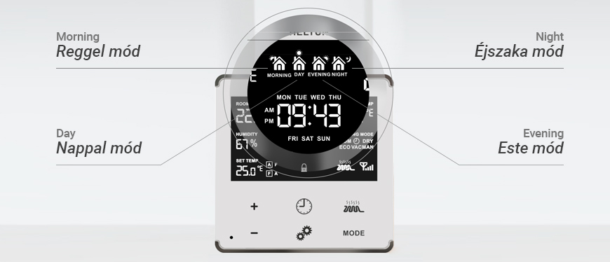 Például a Reggel 7:00-kor kezdődik 23℃-kal, a termosztát 8:30-kor átkapcsol Nappali módra, 17℃-ra. Amikor mindenki hazaérkezik, 16:00-kor elindul az Este 22℃-kal, majd a nap az Éjszaka móddal 22:00-kor, 18℃-kal ér véget. Ezzel jelentősen csökkentheted az energiafelhasználásodat, így a költségeidet. A módokat variálhatod tetszésed szerint, akár külön hétköznapokra és hétvégékre is.