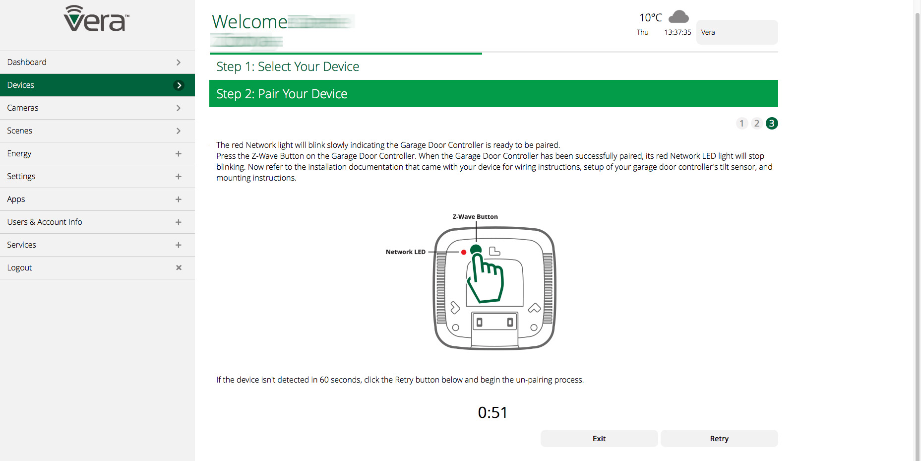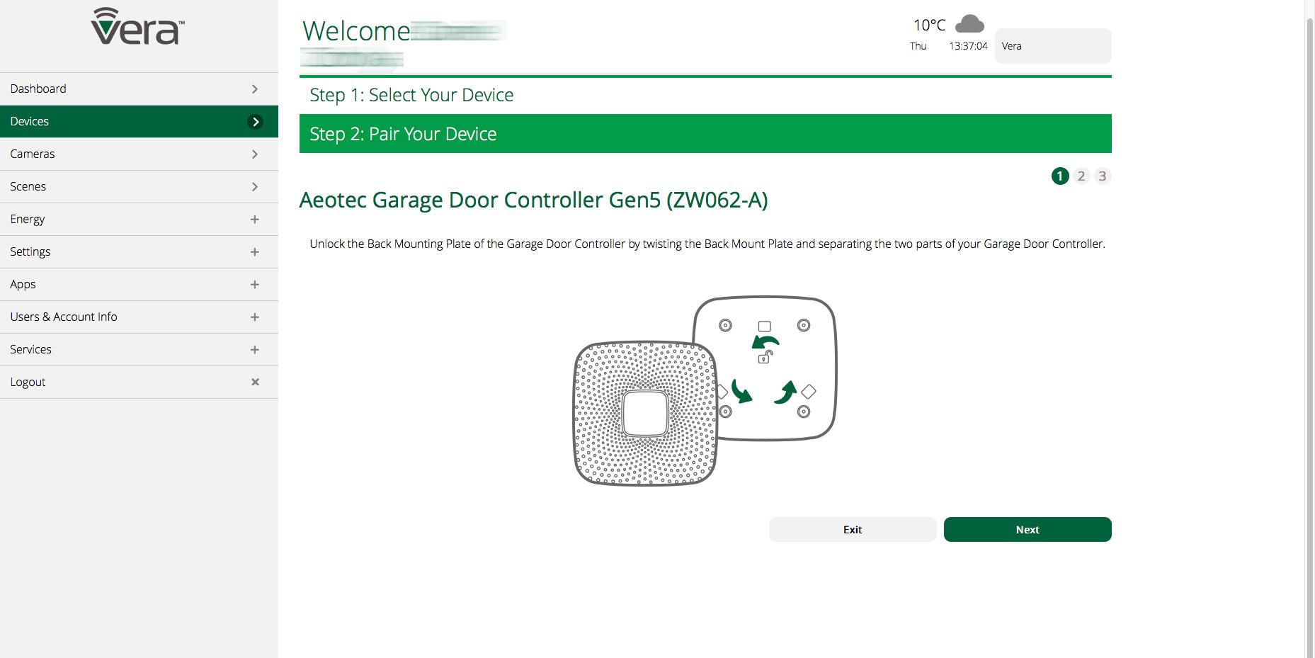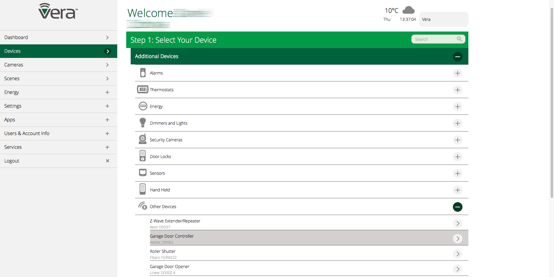 A Vera főmenüben kattintsunk a "Devices", majd az "Add Device" menüre! A listából válasszuk ki a vezérlőt (AEOTEC ZW062):