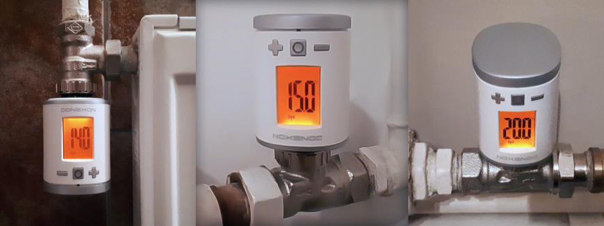 Lássuk a radiátortermosztátokat! Z-Wave-es radiátortermosztátokat illesztünk a rendszerbe. Ezek a központhoz kapcsolódva biztosítják, hogy minden radiátor mindig a kívánt beállítások szerint működjön. Esetünkben Donexon varmo TZ eco radiátortermosztátokat használtunk. Ezek a termosztátok M30-as csatlakozással rendelkeznek, ilyen menettel rendelkező szelepre egyszerűen felcsavarhatók, de a gyári csomag tartalmaz 3-féle adaptert is (RAV, RA és RAVL), így az más szabványú szelepekhez is illeszthetők. A példánkban szereplő házban nem minden radiátor rendelkezett a megfelelő szelepekkel, így ezeknél a nagyon régebbi radiátoroknál fűtésszerelő segítségét kellett kérni a nekünk megfelelő, praktikusan M30-as szelepek beszereléséhez: