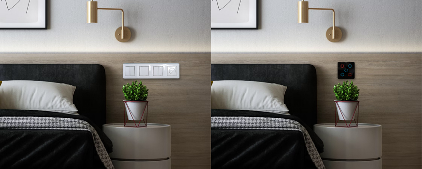 Ahogy azt régebbi híreinkben is megmutattuk, az árnyékolóinkat is vezérelhetjük vele, nem feltétlenül van szükség egy különálló redőnykapcsolóra! Ezek a hírek elérhetők IDE és IDE kattintva. Ugyanígy alkalmas fényerőszabályzós modulok, dimmerek irányítására is. Természetesen az érintőgombokat használhatjuk a rendszer bármilyen folyamatának indítására is. Indíthatunk redőnyöket (többet is egyszerre), kapubezárásokat, kerti világítást, stb., és akár az okosotthon-rendszer üzemmódjai is beállíthatók egyetlen gombnyomásra. Ezért a tervezéskor esetleg már arra is gondolhatunk, hogy a megvásárolt kapcsolón több gomb legyen, így a világításon kívül kihasználhatjuk az ilyen folyamatok indítására is.