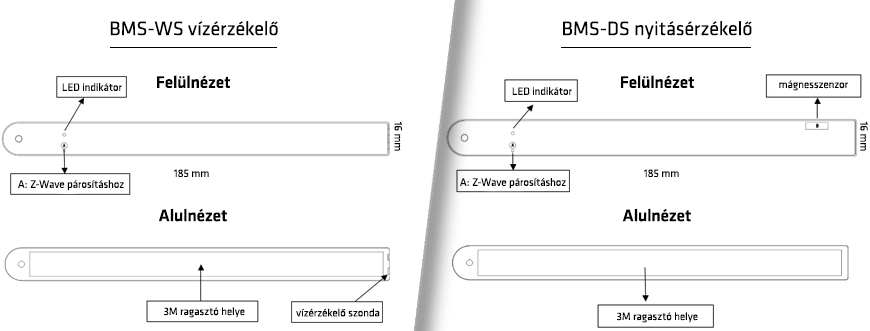 A szenzorok lapos kialakítása lehetővé teszi az egészen szűk helyeken történő elhelyezést is. Így akár bútor mögé vagy nyílászárok falcaiban is alkalmazhatók. Az érzékelők 185 × 16 × 3 mm-esek, rögzítésük a 3M-es kétoldalas ragasztónak köszönhetően stabil és időtálló, ezt a termékek csomagjában tartozékként megtalálhatjuk. Ha azonban mégis áthelyeznéd vagy leszednéd, egyik előző cikkünkben találsz pár információt az egyszerű és gyors eltávolításra. A tokozás alul ABS műanyagból, felül pedig edzett üvegből készült, aminek köszönhetően merev és ellenálló. Mind a BMS-DS és a BMS-WS érzékelő IP65-ös minősítéssel rendelkezik, így beltéren akár vizes vagy poros környezetben is problémamentesen használható. A működési hőmérsékletet -20 és +60 °C között határozta meg a gyártó, de elemes eszköz lévén, nem javasolt hosszasan hidegnek kitenni, mert az korai elemmerüléshez vezethet. A termékek Z-Wave 700-as chippel kerültek piacra, ami hosszú elemélettartamot, gyors és nagy hatótávolságú kommunikációt tesznek lehetővé.