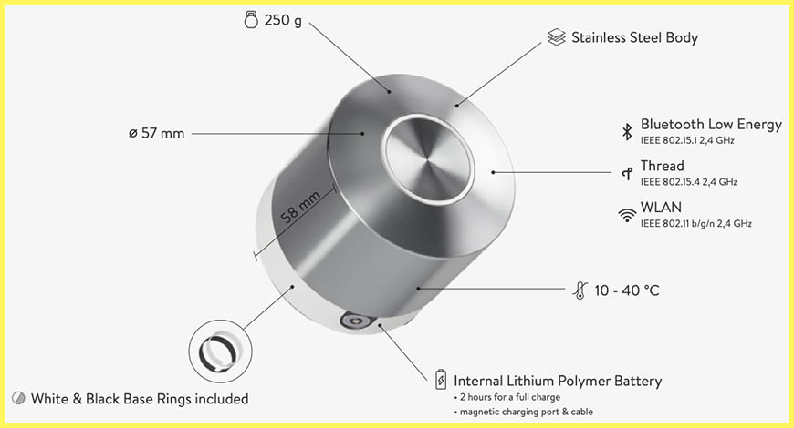 - 2 óra alatt teljesen feltölthető, akár 6 hónapig használható 1 töltéssel (Bluetooth-on vélhetően, WiFi-t és/vagy Thread-et használva valószínűleg rövidebb ideig bírja)
