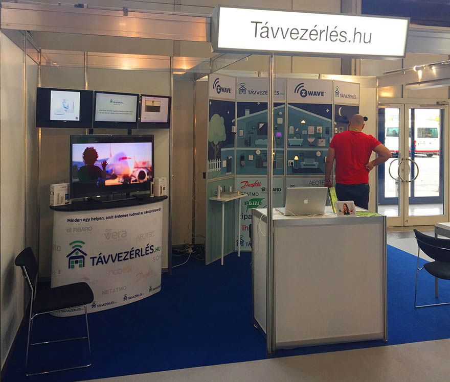 A hozzánk látogatók ugyanis nem egy adott gyártó egyedi megoldásával, általában zárt, vagy csak néhány külső eszközzel kompatibilis termékeivel ismerkedhetnek meg, hanem egy SZABVÁNNYAL! A világ legnépszerűbb otthonautomatizációs szabványát, az USA-ból származó Z-Wave-et mára már több mint 300 gyártó követi. Jelenleg 1500-nál is több termék között mindenki talál megoldást, legyen szó bármilyen furcsa igényről is. A Távvezérlés.hu 15 m2-es standján kiállítottunk egy „makett” házat, amelyben több mint 25, különféle gyártótól származó eszköz (pl. szélsebességet is mérő időjárás-állomás, szénmonoxid-érzékelő, RF-ID beléptetőrendszer, ajtózár, arcfelismerős kamera, termosztát, világításvezérlő, vízérzékelő, vízcsapot elzáró elektronika, RGB égők és LED-szalagok, radiátorszelep, stb.) működik a vezérlőközpont által felprogramozott módon, illetve irányítható akár látogatóink által is, többféle kapcsoló és távvezérlő, de akár gesztusok (egyedi kézmozdulatok) segítségével is:
