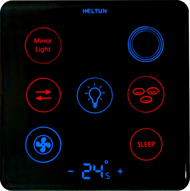 A legnagyobb változás az érintőkapcsolóknál történik. Megszűnnek az eddig ismert 1–5 gombos modellek, egyetlen, 7 érintőgombbal és 5 relével rendelkező kapcsoló váltja fel őket. A 7 gomb közül bármelyik gomb letiltható, a letiltott gombok teljesen láthatatlanok lesznek, így a felhasználó tetszőlegesen állíthatja be, hogy az eddigi 1-5 gombos kapcsolókhoz hasonló, vagy akár 6 vagy 7 gombos kapcsolót szeretne használni. Minden gombhoz 7 színű háttérvilágítás választható itt is. Ráadásul gombokhoz tartozó ikonok cserélhetőek! A dobozban 100 különböző ikonfilm található. Az ikon cseréje nagyon egyszerű lesz. A jelenlegi Heltun kapcsolóknál alapfelszereltségnek számító hőmérséklet-, páratartalom- és fényszenzorok maradnak, és egy egyszerű termosztátfunkció érkezik pluszban. Ez csak fűtésre szolgál, belső vagy külső NTC hőmérséklet-érzékelőkkel, az immár kijelzett hőmérsékletadatok melletti +/- érintőgombokkal. Nincsenek változatos fűtésmódok, csak a legegyszerűbb termosztátfunkció, kívánt hőmérséklet (setpoint) beállítási lehetőséggel. A maximális terhelés 16A lehet.