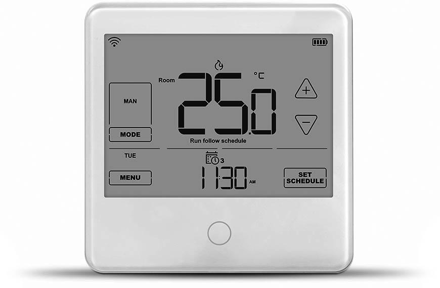 - Egyetlen érintéssel válthatunk az üzemmódok között: AUTO (az általunk beállított programok szerint), VACATION (amikor magára hagyjuk hosszabb időre a lakást, a termosztát egy előre meghatározott – alaphelyzetben ez 16 ºC, de 1–99 ºC között bármi beállítható – hőmérsékletet fog állandóan tartani, megakadályozva a fagykárokat, vagy akár a növények megfázását) és MAN (kézi mód, a kijelzőn beállított hőfokot tartja, nem nézi a programokat, ha vannak).