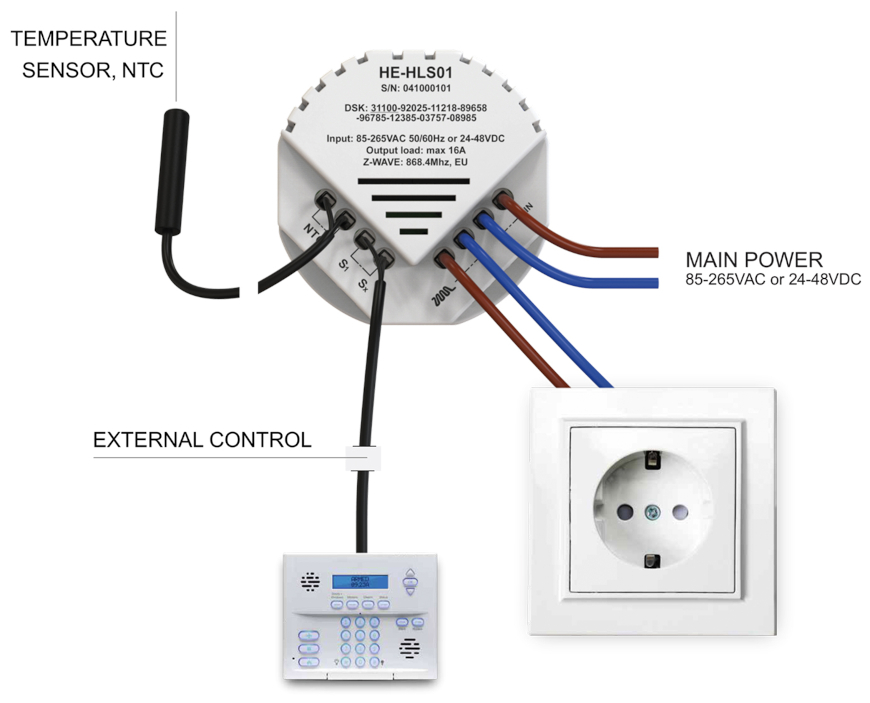Annak ellenére, hogy a HELTUN High Load Switch-nek nincs kijelzője vagy gombja, egy Z-Wave központhoz párosítva egy termosztát összes funkciója megvalósítható vele. Beállíthatók a szokásos fűtési üzemmódok, de akár időzített működést is beállíthatunk Z-Wave paraméterek segítségével, a hét minden napjára 4 különböző hőmérsékleti értékkel. Így sok helyen termosztátként is alkalmazható, ahol nincs szükség a kijelzőn levő adatok leolvasására és a beállítások sűrű változtatására. Csatlakoztathatunk egy NTC hőmérséklet-érzékelőt a helyiség hőmérsékletének figyelemmel kísérésére.