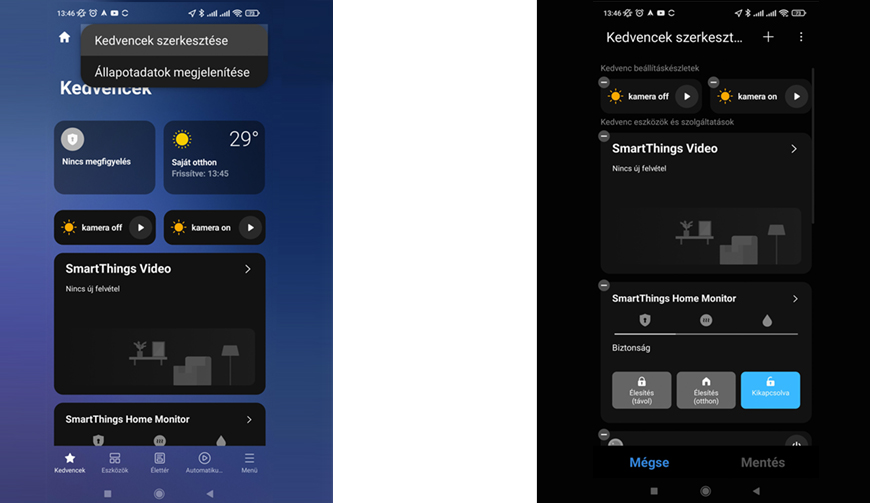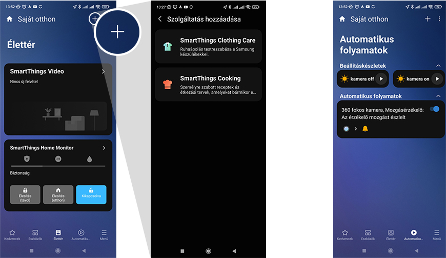 A következő menüpont az Élettér, ahol a smart home monitort és annak beállításait találhatjuk – itt lehet az „otthon” és „távol” állapotokat menedzselni, és a füst- és vízérzékelőket nyomon követni. Illetve, ha rendelkezünk további SmartThings kompatibilis háztartási gépekkel – mint mosógép, szárítógép, hűtőszekrény –, akkor a „Clothing Care” (ruhaápolás), és „Cooking” (főzés) funkciókat is kihasználhatjuk. Ha erre nincs szükségünk, könnyedén eltávolíthatjuk a menüből ezeket a pontokat.