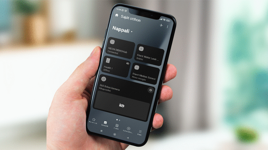 A legelső menüpont a Kedvencek, itt tudjuk a leggyakrabban használt funkciókat összegyűjteni, és fontossági sorrendben egymás alá sorakoztatni. Itt megjeleníthetők az állapotadatok az automatizmusok gyorsindító gombjai és tetszőleges eszközök. Tehát a kedvencekben a teljes rendszer funkcióiból gyúrhatunk össze saját ízlésünk szerint egy egyedi almenüt. Ezt követi az Eszközök menüpont, ahol az összes telepített eszközt elérhetjük helyiségek szerint csoportosítva. A helyiségek között oldalra söprő mozdulattal tudunk váltani, vagy akár használhatjuk a bal felül lenyitható szobalistát is, gyorsan kiválasztva a szükséges területet. Itt is célszerű az eszközök sorrendet kedvünk szerint testre szabni.