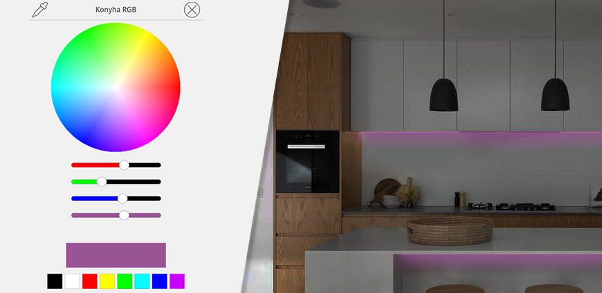 - Több kapcsolóval a színek változtatása is megoldható, de ezt legkényelmesebben az okosotthon mobilapplikációjában végezhetjük el egy egyszerű színkeverővel. Az itt kikevert vagy előre kitalált színek természetesen lementhetők az okosotthon-rendszerben, és ha kell, következő alkalommal tökéletesen ugyanazt a színt kapjuk vissza, amit legutóbb sikerült megszeretnünk – ellentétben a régi, vagy egyszerűbb eszközökkel, ahol egy színváltás után nehéz kézi beállítással megint ugyanazt a színt megtalálnunk. Az okosotthon-rendszerekben kedvenc színeinket akár RGB értékeik szerint is beprogramozhatjuk a központba. Kedvenceinket egyetlen gombnyomással előhívhatjuk. És ha egy nagyobb helyiségben több különálló LED-szalag is van, akkor semmi akadálya, hogy egy mozdulattal minden helyen egyszerre és ugyanúgy változtassuk a színeket vagy fényerőket.