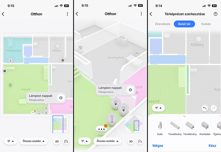 A térképnézetbe a SmartThings alkalmazás felső menüsorában a + jel előtt megjelent házikó ikonnál tudunk belépni. A beépített szerkesztőprogram segítségével meglepően könnyedén megrajzolhatjuk a lakás alaprajzát; egy négyzetrácsos lapon elhelyezhetjük a falakat, kialakíthatjuk a szobákat, bejelölhetjük a térelválasztókat, de még az udvar is berajzolható, hiszen lehetnek kültéri okoseszközeink is. Ha készen vagyunk az alaprajzzal, a Belső tér fülön számos berendezési tárgyat (különböző típusú kanapékat, székeket, asztalokat, növényeket, ajtót és ablakot, mosdókat és kádakat, de még zongorákat és macskaalmokat is) találunk, amelyekkel még jobban hasonlóvá tehetjük a megjelenő látványt a valódihoz: