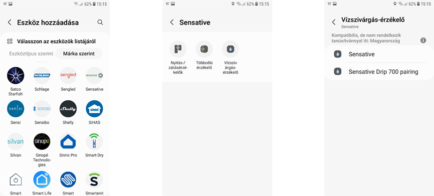 A párosítás a már megszokott módon, nagyon egyszerűen elvégezhető: a SmartThings applikációban belépés után az eszközök listájában „Márka” szerint megtaláljuk a Sensative logóját. Ezt kiválasztva a három érzékelő típus választható, majd a konkrét érzékelő (régi vagy akár 700-as széria is).