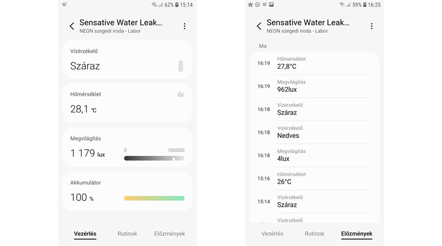 A kezelőfelületen a vízszivárgás-érzékelő esetében természetesen látható a vízérzékelés állapota (száraz/nedves) magyar nyelvű feliratokkal. De ezen kívül hőmérséklet és fényerő adatokat is leolvashatunk. Igen! A Sensative Strips Drip vízérzékelő ezeket az értékeket is képes mérni nekünk. Itt találjuk még az elem töltöttségét mutató adatot is.