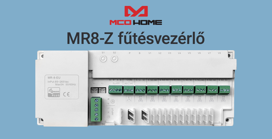 Az MCO Home MR8-Z egy DIN-sínre szerelhető, 8 fűtési kör, valamint egy kazán és egy keringető szivattyú együttes vezérlésére alkalmas fűtésvezérlő. A nyolc csatornás Z-Wave vezeték nélküli kommunikációval akár 8 termosztáthoz is csatlakoztatható, 8 szobahőmérséklet egymástól független szabályozására. A termosztátokat közvetlen Z-Wave asszociációval érdemes az MR8-Z-hez kötni, így vezérlőközpont nélkül (pl. annak meghibásodásakor) is működik a fűtés a vezeték nélküli termosztátok kérései alapján. A szelepek vezérlésére és állapotainak ellenőrzésére történhet egy okosotthon-központ segítségével is. A 8 fűtési kör bármelyikének használatakor indítja a kazánt és a keringető szivattyút. 2 db külső hőmérő szenzor (tartozék) csatlakoztatható, melyekkel akár a rendszerben keringő víz hőmérsékletét is ellenőrizhetjük. Valamint lehetőség van egy kültéri hőmérőszenzort Z-Wave asszociációval az eszközhöz kapcsolni, mellyel fagymentesítő funkciók is megoldhatók. A beépített Z-Wave 800-as chip biztosítja a legmagasabb szintű (S2) biztonságot, valamint a gyors és nagy hatótávú kommunikációt.