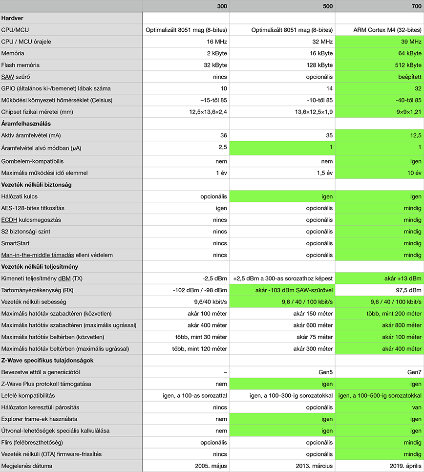 Akik számára fontosak a részletes adatok, azoknak az alábbi táblázatba összegyűjtve láthatók a különböző Z-Wave generációk (300, 500 és 700) közötti eltérések, jól szemléltetve a protokollban rejlő lehetőségeket (zölddel jelölve a legjobb érték az adott sorban):