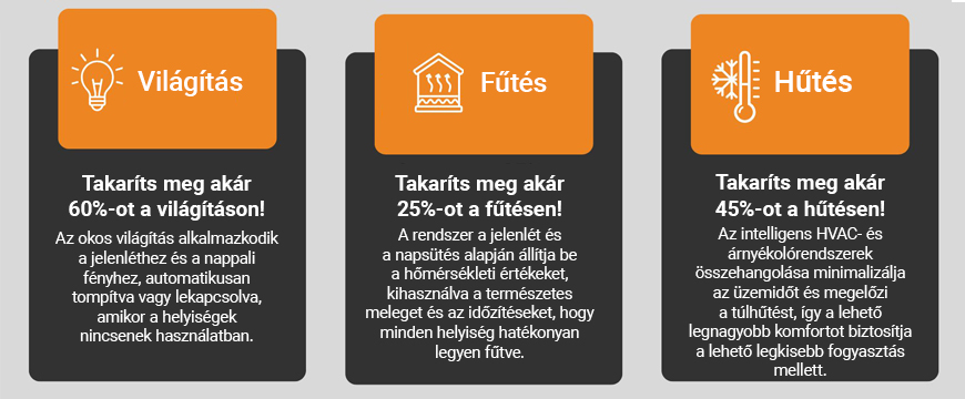 Okos megoldásokkal az épület gyorsabban reagál a változásokra, és mindig a lehető legköltséghatékonyabban üzemel.