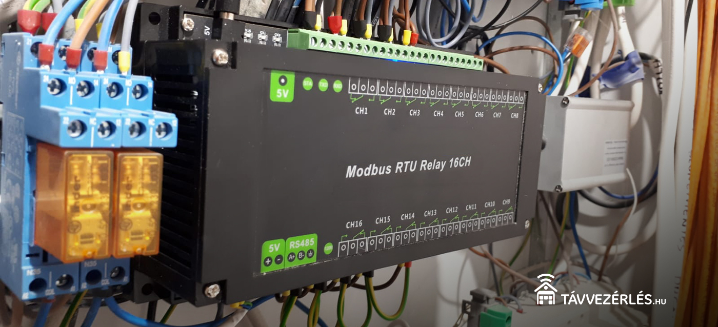 Egy ilyen komplex rendszer esetén hamar nyilvánvalóvá vált, hogy nem a leghatékonyabb megoldás több különálló (például Z-Wave-es) relémodult használni. Ehelyett egyetlen, 16 csatornás Modbus RTU relémodul mellett döntöttünk.