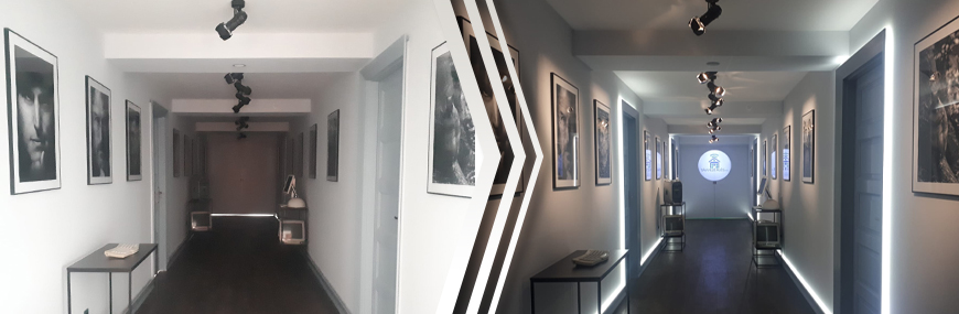Irodánk folyosóján kifejezetten sok különálló világítási kör található. A mennyezeti lámpák több szakaszra bontva világítják meg az oldalfali képeket, emellett padló- és ajtókörüli LED szalagok is külön vezérelhetők.